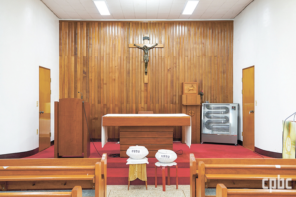 두 개의 단으로 회중석과 구분해 제단을 꾸며 놓았다. 제단에는 나무 제대와 독서대·감실이 있고, 제대 뒷벽 중앙에는 나무로 만든 십자가상이 설치돼 있다. 제단 좌·우측에 제의실과 준비실을 갖추고 있다.