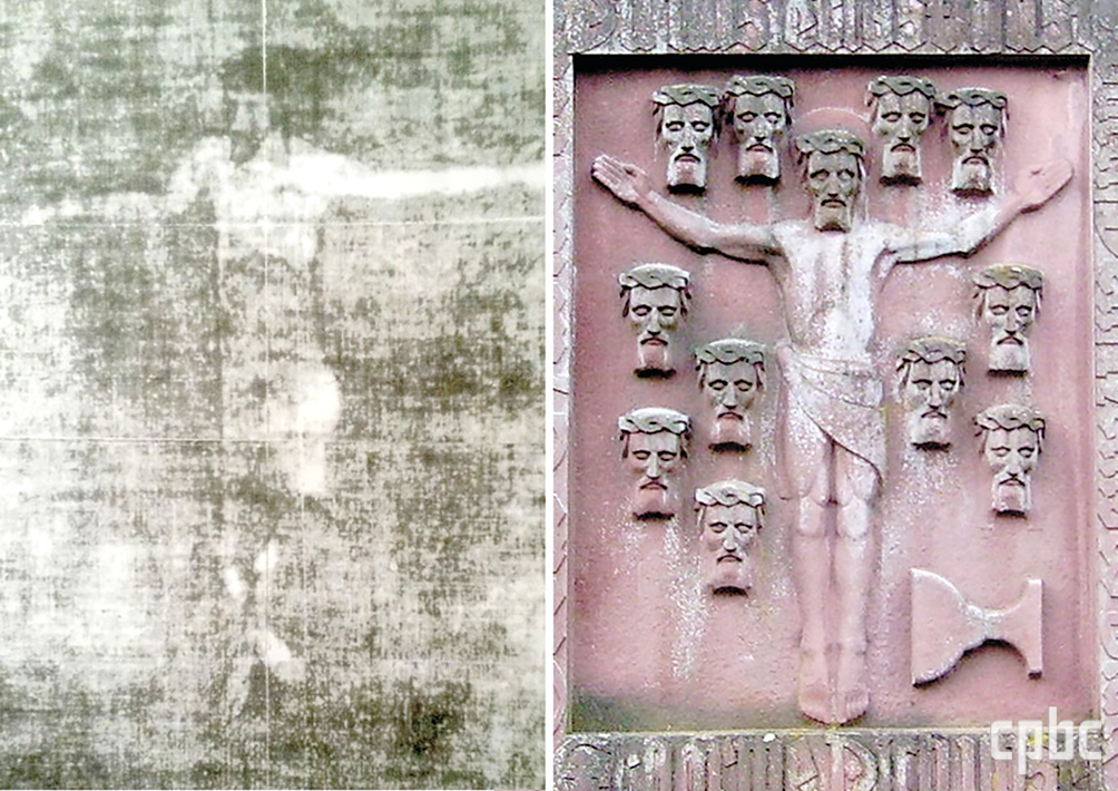 1330년 성혈 기적의 성작보를 적외선으로 촬영한 사진(좌). 십자가에 달리신 그리스도와 베로니카 수건에 나타났던 얼굴상이 희미하게 식별된다. 이를 형상화한 부조 기념물(우)이 성당 마당 야외 제대에 세워져 있다.