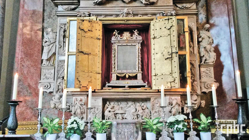 성혈 기적 소식은 순식간에 사방으로 알려졌고, 1445년에 성작보를 교황청으로 가져가게 됐습니다. 에우제니오 4세 교황은 공식적으로 기적을 인정하고 대사를 허락하며 발뒤른 순례를 장려하지요. 그 기적의 성혈 성작보가 성당에 보존되어 있습니다. 지금은 많이 빛바랬지만, 십자가에 못 박힌 구세주의 모습이 흐릿하게 남아 있지요.