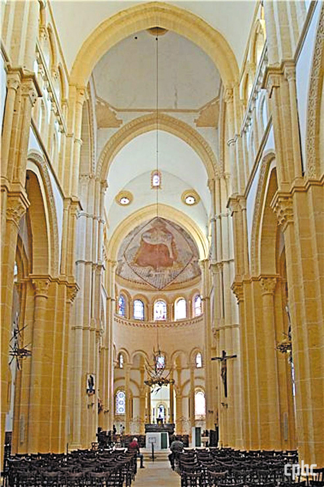 성당에 들어서면 로마네스크 성당답게 입구부터 가대석과 후진까지 축이 명료합니다. 반복되는 아치와 기둥이 시선을 옆으로 흩뜨리지 않고 주 제대로 모읍니다. 주 제대의 천장으로 전능하신 창조주 하느님을 그린 14세기의 프레스코화가 보입니다. 그런데 성당 이름과 달리 예수 성심을 주제로 한 이미지가 잘 눈에 띄지 않습니다. 그건 이곳이 처음부터 클뤼니 수도원 전통의 노트르담 수도원 성당으로 시작했기 때문입니다.