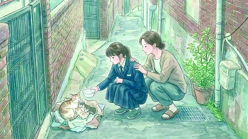 딸과 함께 급식소에 가보니, 허름한 창고 밑바닥에 어미 고양이와 젖먹이 새끼들이 있었다. 작은 어미 품에 꼬물대는 어린것들을 보니 심란했다. 사방에 차가 달리는 도심에서 어찌 살아가려나 싶었다. 자의 반 타의 반 캣맘이 된 것은 그날부터였다. 딸에게 그 일을 맡길 수는 없었기 때문이다.