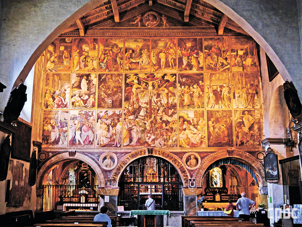 바랄로 산타 마리아 델레 그라치에 성당의 ‘가우덴치오의 벽’. 가우덴치오 페라리가 1513년에 그린 폭 약 10.4m, 높이 약 8m의 대형 프레스코화. 주님 탄생 예고부터 부활까지 그리스도의 생애를 21개 장면에 담은 프레스코 연작으로 사크로 몬테 순례의 서막을 알린다.