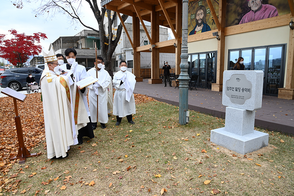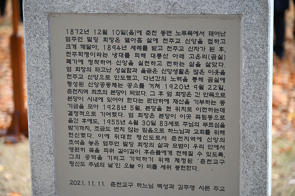 2021년 11월 춘천교구장 김주영 주교가 죽림동 주교좌성당에서 엄주언 말딩 송덕비를 축복하고 있다. 가톨릭평화신문 DB