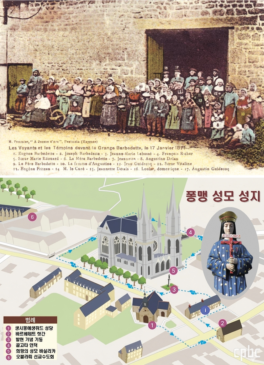 퐁맹 성모 발현 목격자와 증언자들(위)과 성지 안내도(아래). 1871년 발현 뒤 시현자들의 삶도 각기 신앙의 길로 이어졌다. 바르베데트 외젠은 라발 교구 사제, 동생 조제프는 오블라띠 선교수도회 사제가 되었고, 잔 마리는 보르도 성가정 수녀회에 입회했다.