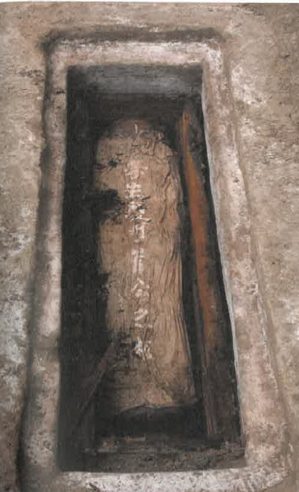최양업 신부 개장 작업을 통해 드러난 최 신부의 유해. 유해 위로 ‘學生慶州崔公之柩’(학생경주최공지구)라 적힌 명정이 보인다. 원주교구 제공