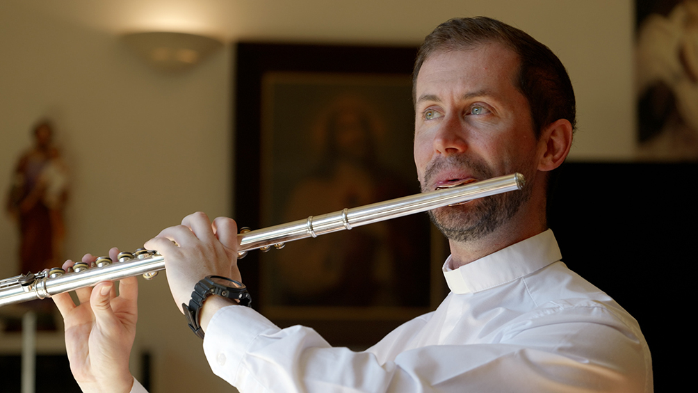 하느님의 사랑 선교 수도회 마이클 라스트 신부가 시드니대교구 세인트 데클란 성당에서 플루트를 연주하고 있다.