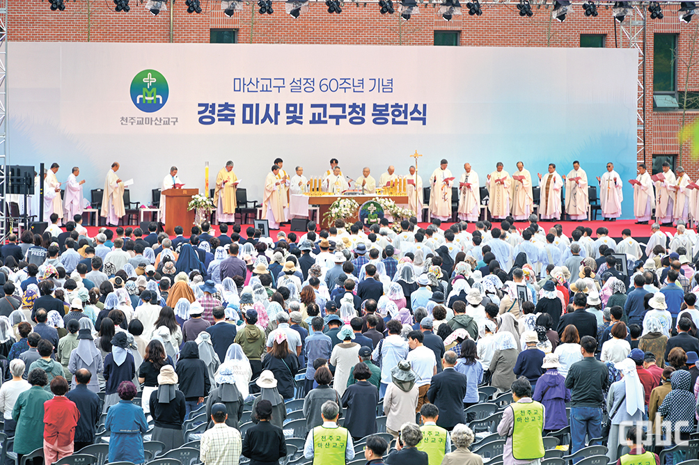 교구는 이날 경남 창원 마산합포구 죽헌로 72 새 교구청에서 교구장 이성효 주교 주례로 교구 설정 60주년을 경축하고, 새 교구청 봉헌미사를 거행했다. 이 주교는 지난 60년을 돌아보며 “초대 마산교구장 김수환 추기경님은 가난하고 척박한 이곳에 파티마병원을 유치하는 등 노력을 기울이셨다”며 “오늘 우리는 제2대 교구장 장병화 주교님을 비롯한 전임 교구장 주교님들께서 교구를 위해 동분서주 노력하며 헌신하심을 기억한다”고 전했다.