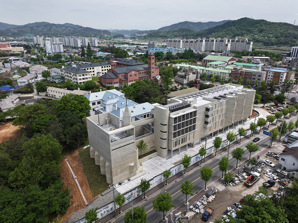 다음으로 고려한 건 성지의 대표 건축물인 대성당과의 조화였다. “남양성모성지에는 우뚝 솟은 40m 높이 반원형 타워가 있는 대성당이 있습니다. 성지 전체를 압도할 만한 형태와 높이와 규모죠. 다른 건물이 또 형태를 갖고 들어서면 대성당을 저해하는 풍경이 될 수밖에 없습니다. 서로 상징성을 방해하지 않도록 하는 게 대성당에 대한 예의이자 앞으로 지어질 건축물들의 숙명입니다.”