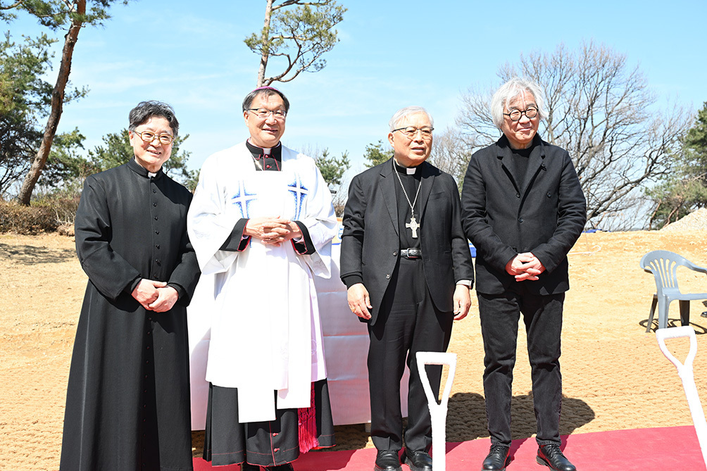 지난 3월 9일 ‘순교자의 언덕’ 기공식에서 함께한 승효상 건축가(오른쪽부터)와 염수정 추기경, 곽진상 주교, 이상각 신부가 기념사진을 찍고 있다.